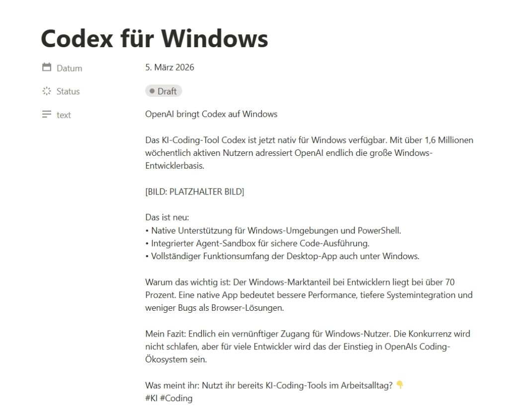 - Der LinkedIn Drafter: Ein orchestriertes System aus drei Agenten (Researcher, Creator, Fact-Checker), das Arbeitsdokumente, E-Mails und News auswerten kann, Fakten per Websuche verifiziert und Post-Entwürfe für Social Media direkt in Notion speichert.