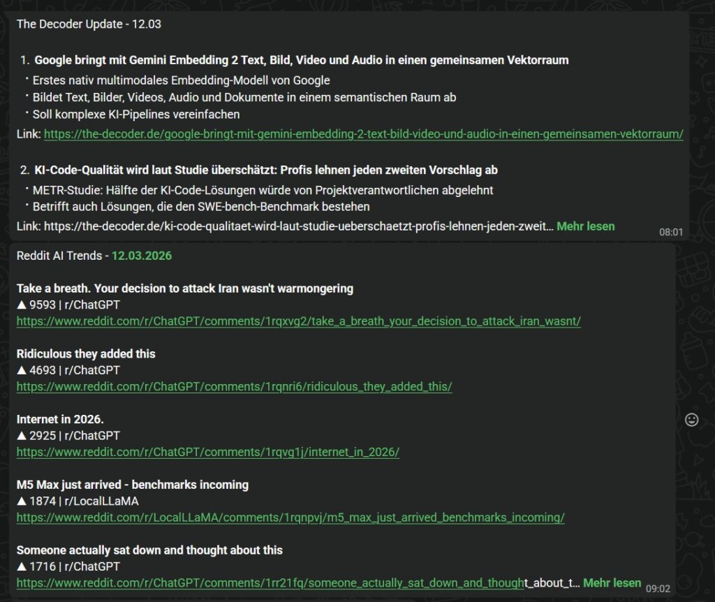- Der News Agent: Ein Agent, der täglich RSS-Feeds, Webseiten und Foren nach relevanten Tech-News durchsucht, diese filtert und Zusammenfassungen direkt per WhatsApp-Nachricht um 08:00 Uhr als Morning-Briefing liefert.